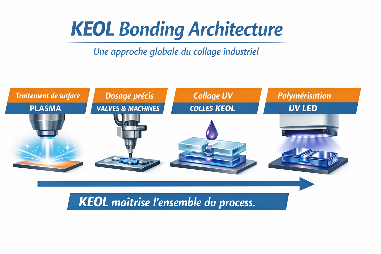 KEOL est une entreprise spécialisée dans la distribution d’équipements industriels et de solutions techniques innovantes. Nous accompagnons nos clients dans leurs projets grâce à une offre complète incluant le traitement plasma, les systèmes de collage, le dosage et les équipements de process. KEOL est également fabricant de colles UV, développées pour répondre aux exigences de performance et de fiabilité des applications industrielles. Grâce à notre laboratoire d’essais, nous réalisons tests, validations et accompagnements techniques sur mesure. Nous proposons aussi des services de conseil, formation et support. Notre objectif est d’apporter des solutions performantes, adaptées et durables, avec un haut niveau de réactivité et de qualité de service.