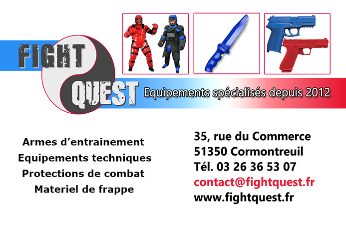 Spécialiste Français reconnu des armes et équipements d'entrainement au close Combat: Stun knife à choc éléctrique et couteaux d'entrainement, Blue Gun/Red Gun, protections, matériel de Frappe, combinaisons Blackman/Blueman/Redman, boucliers et bâtons d'entrainement, équipements de sports de combat… Depuis 2012, FightQuest équipe les unités et structures les plus prestigieuses et exigeantes en équipement d'entrainement au close combat.